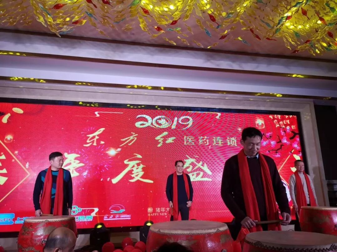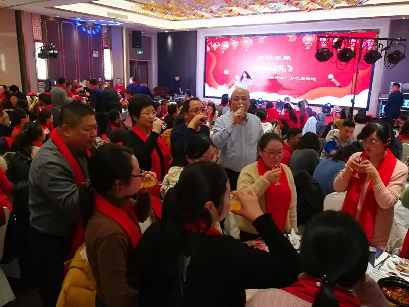 ※上海华氏大药房有限公司党委书记胡颖女士、上海华氏大药房有限公司工会主席任善稳先生、上海华氏大药房有限公司对外投资部总经理顾营先生、盐城东方红大药房有限公司总经理韩洲先生为东方红的家人们敬酒※